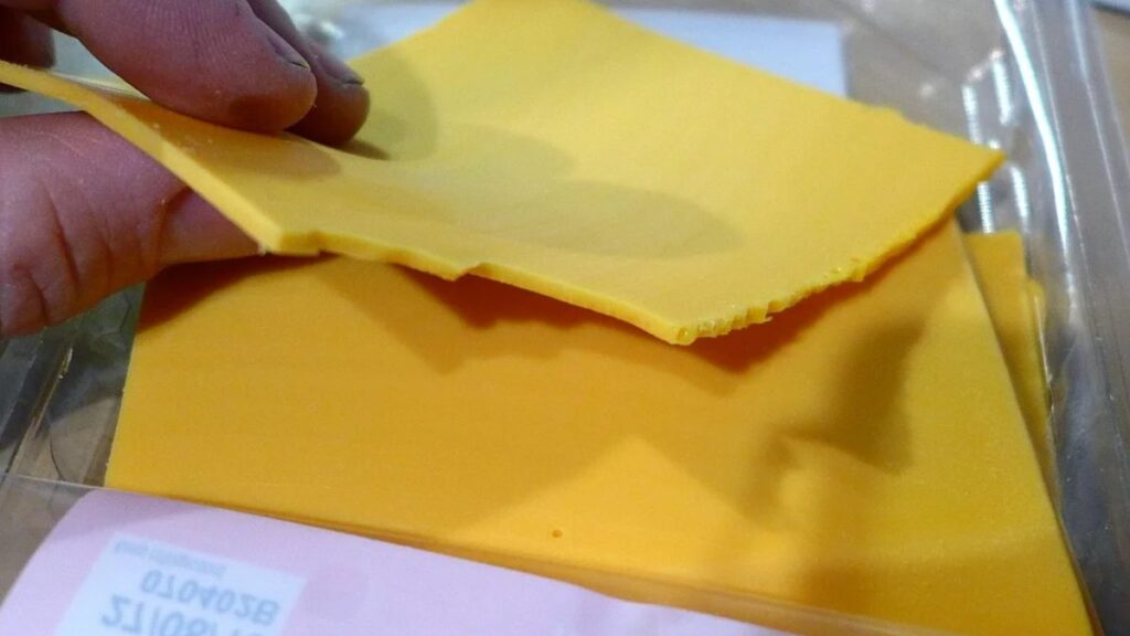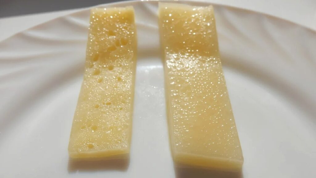 Відрізняється сир з добавками і за структурою. Він більше нагадує гуму або пластилін . При нарізанні може кришитися, а його шматочки липнуть до ножа. Від такого «делікатесу» краще відмовитися.