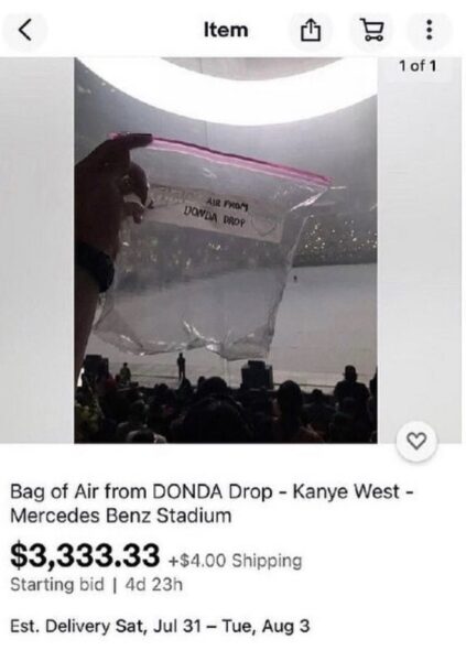 Так-так, справжнісінький пакет з повітрям, початкова ціна близько $ 3000, а пішов в підсумку за $7600. Це що взагалі таке було? Жарт? На жаль або НЕ на жаль, але реальність. Причому, як з’ясували журналісти, традиція вже кілька років тягнеться. Фанати, які не зуміли побувати на концертах Уеста, купують сувеніри звідти. Включаючи пакети з повітрям.