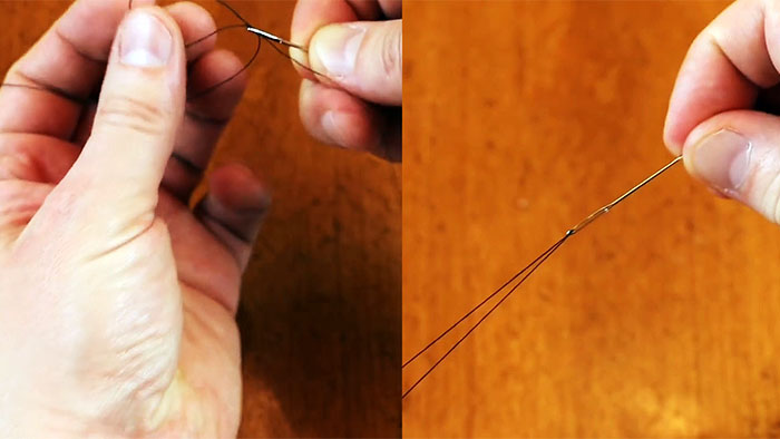 Тепер зверху розміщуємо голку так, щоб вушко розташовувалося на середині нитки. Далі притискаємо голку до нитки і починаємо водити нею в сторони «туди-сюди».