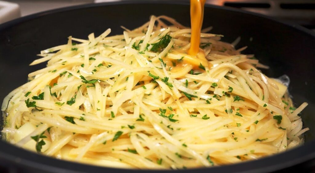 Тремо картоплю на тертці для корейської моркви і заливаємо холодною водою, щоб прибрати крохмаль.