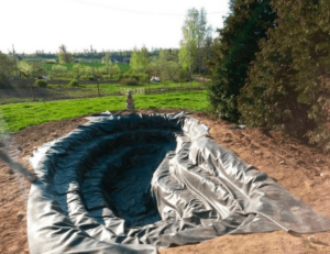 Коли все було готове, він засипав туди піску, утрамбував, а потім замовив спеціальне полотно під свій розмір і застелив ним ставок. Тепер воду не пропускатиме і можна її заливати.