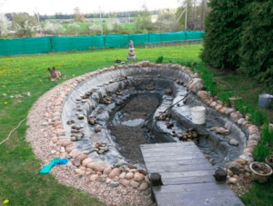 Коли всередині все було готове, знизу він засипав трохи щебеню, поклав каміння для організації природнішого середовища. Зверху, щоб не було бруду і можна було підходити до ставка, чоловік спочатку обклав усе більшим каменем, а решту засипав великим щебенем. Основа готова, можна заливати водою.