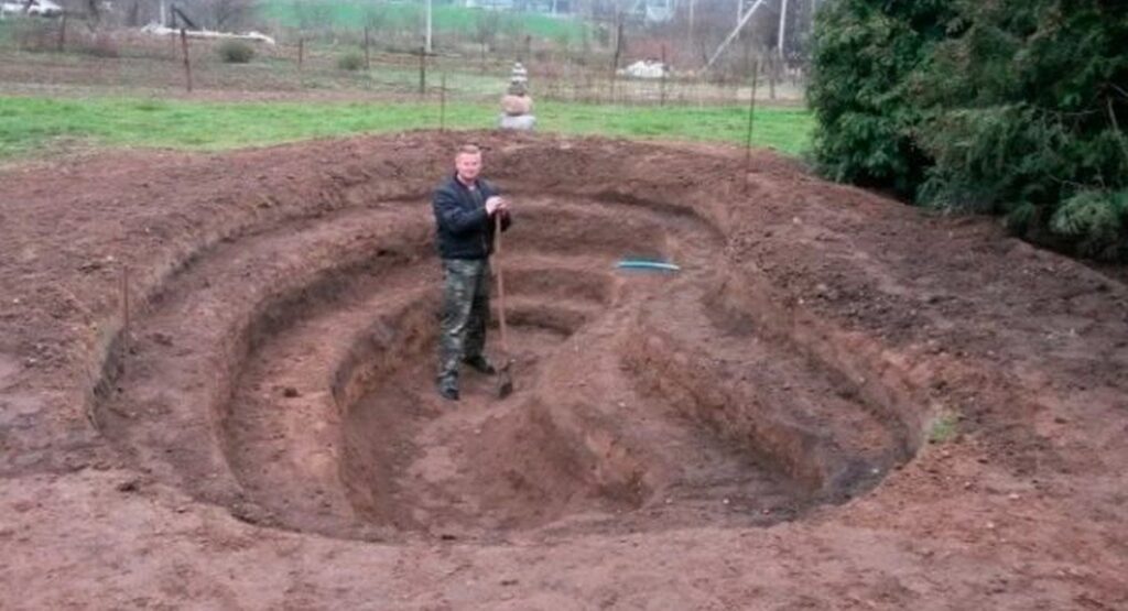 Починав все досить просто та банально. Він викопав яму за 1.60 метра, але зробив так, щоб туди зручно було спускатися з усіх боків. Для цього він копав так, щоб залишилося кілька сходинок.