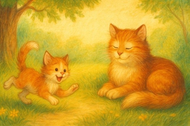 У затишному куточку саду стара кішка лежала на м’якій траві й грілася під лагідним сонцем. Її очі були напівзаплющені, а вусики ледь-ледь тремтіли від теплого вітру. І тут повз неї, мов блискавка, промайнуло мале кошеня — вертке, жваве, мов кулька енергії. Воно перекинулося через себе, крутнулося, підстрибнуло й знову почало крутитися навколо.