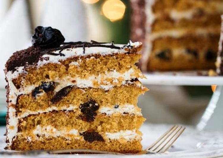 Коржі необхідно смахать кремом, посипати горіхами і сухофруктами. Бока також варто змастити кремом.